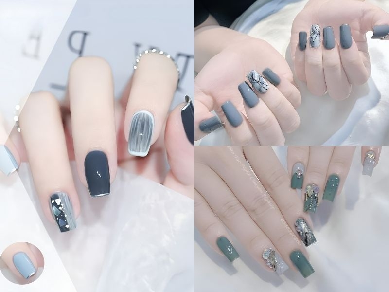 Nail màu xám kim loại cũng là sự lựa chọn thú vị mà ít cô nàng biết đến. Thay vì lựa chọn cho mình một màu xám tối, nàng còn có thể điểm thêm sự thú vị bằng cách xen kẽ các màu sắc khác vào giữa ngón để tạo điểm nhấn.